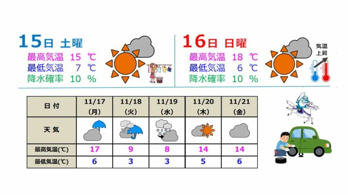 この週末、上越地方はよく晴れそうですが、週明けは一転、早くも冬将軍到来となりそうです。 高田の天気予報 15日(土) ・朝からよく晴れて、洗濯日和の1日に ・最高気温は15度前後と…