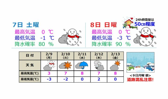 降雪予報 5日(木)夜6時 ~6日(金)朝6時 次第に冬型の気圧配置となる見込みです。このため、天気は西から下り坂となるでしょう。 降雪予報 6日(金)朝6時 ~夕方6時 上空…
