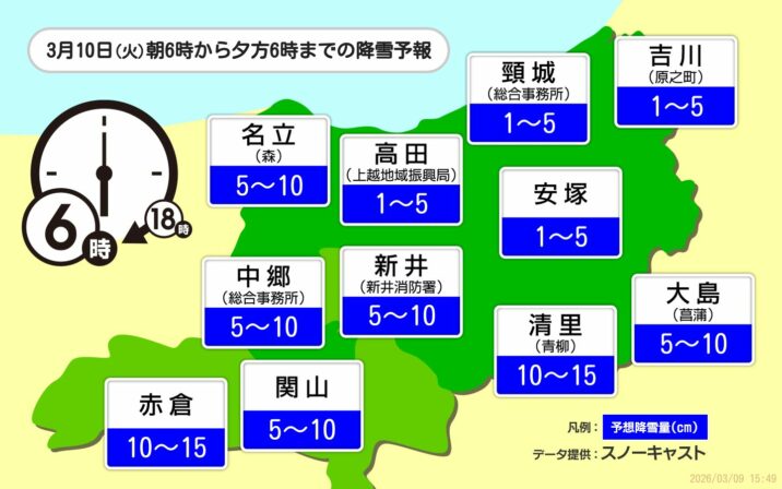 降雪予報 9日(月)夕方6時 ~10日(火)朝6時 低気圧が接近し、上空の寒気も南下する見込みです。このため、明け方頃から次第に雪が降り始めるでしょう。 降雪予報 …