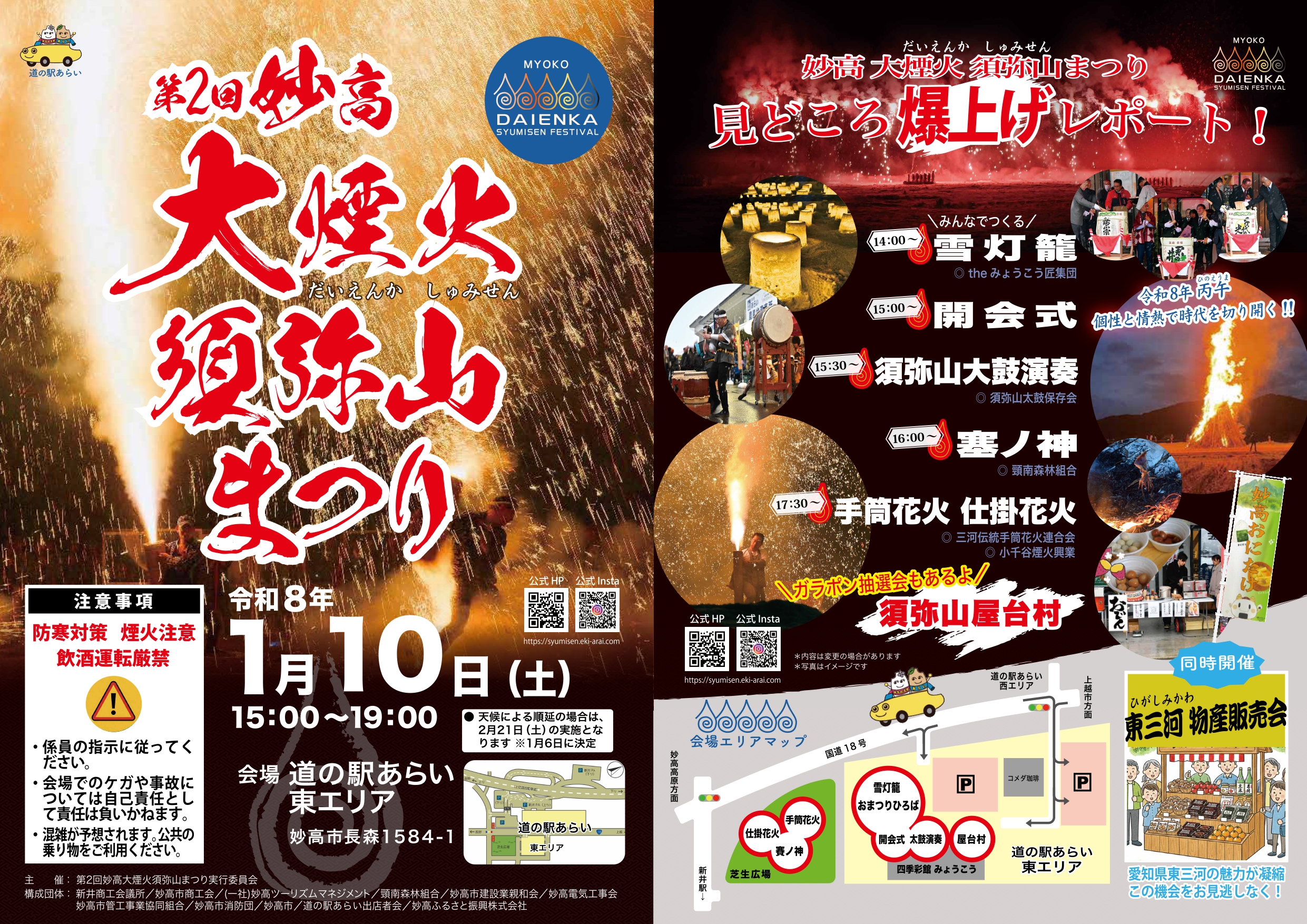 第2回 妙高大煙火須弥山まつりが「道の駅あらい」の東エリアで開催されます。冬だけの特別な工作「雪灯篭(ゆきどうろう)」作り、妙高山をテーマに創作された郷土芸能「須弥山太鼓」をはじめ、「塞ノ神」や「手筒花火」などが行われます。