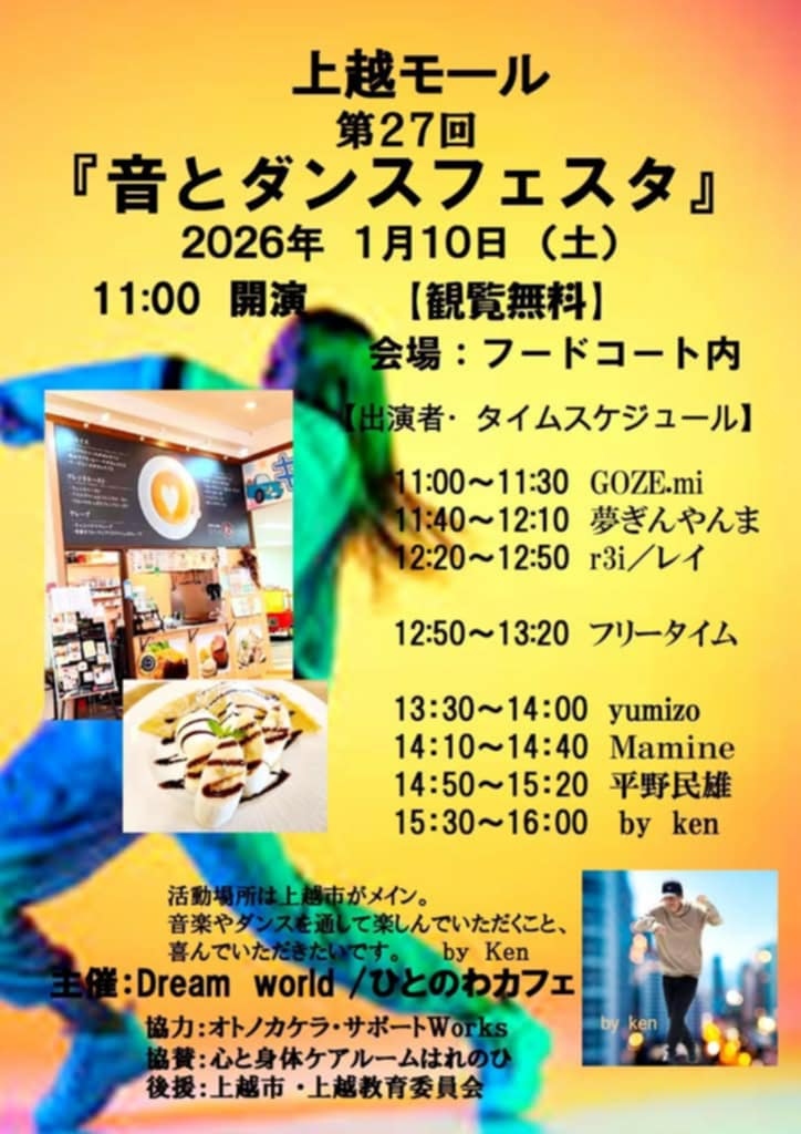 音楽やダンスを通して楽しめるイベント「第27回 音とダンスフェスタ」が上越モールのフードコートで開催されます。