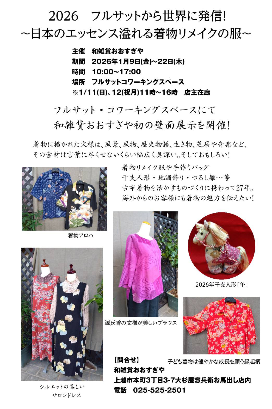 着物リメイク服や手作りバッグ、干支人形、地酒飾り、つるし雛など、古布着物を活かすものづくりに携わって27年。海外からのお客様にも着物の魅力を伝えたいと特別展示会を開催します。1月11日(日)、12日(月・祝)午前11時~午後4時は店主在廊。