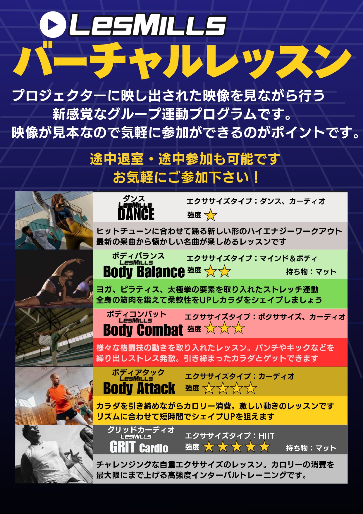 最新の楽曲で楽しむ映像視聴型運動プログラム「LES MILLS バーチャルレッスン無料体験会」がほっとアリーナ妙高高原にて開催されます。大型スクリーンに映し出される映像に合わせて、インストラクターの動きを見ながら運動を行う新しいスタイルのプログラムです。映像が見本となるため、初心者の方や運動に不安のある方でも気軽に参加できます。