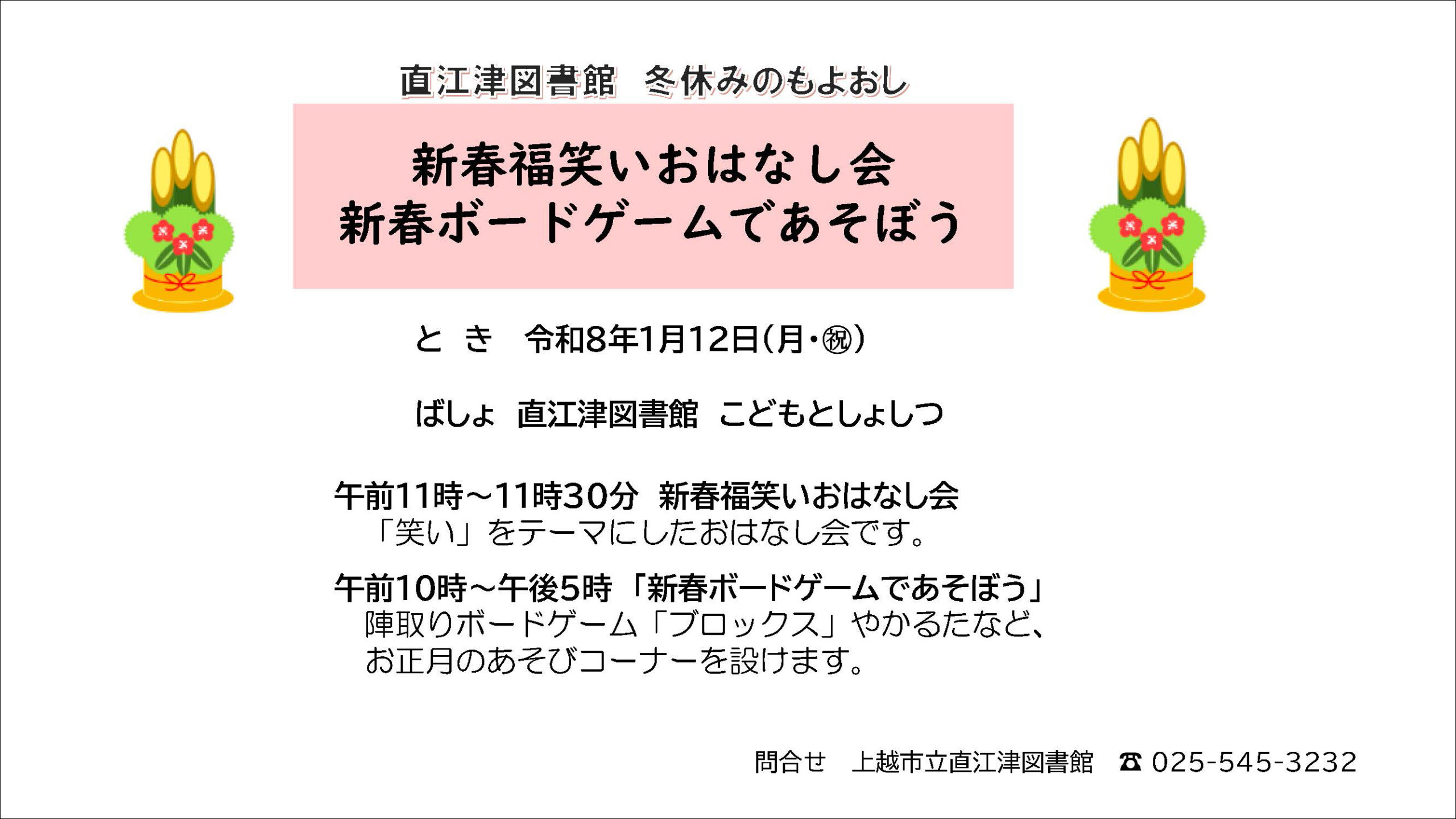 直江津図書館の冬の催しとして、「笑い」をテーマにしたおはなし会「新春福笑いおはなし会」と、陣取りボードゲーム「ブロックス」やかるたなどの遊びコーナーを設けた「新春ボードゲームであそぼう」が行われます。