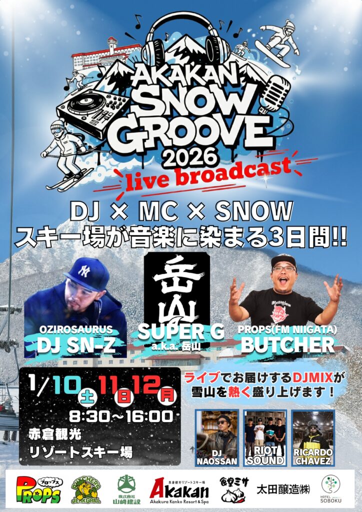 「AKAKAN SNOW GROOVE 2026」が1月10日(土)から12日(月・祝)までの3日間、赤倉観光リゾートスキー場にて開催されます。妙高高原スカイケーブル乗り場内・インフォメーション横の特設DJブースから生放送でお届けする、ライブDJの音楽が、ゲレンデ全体に響き渡ります。