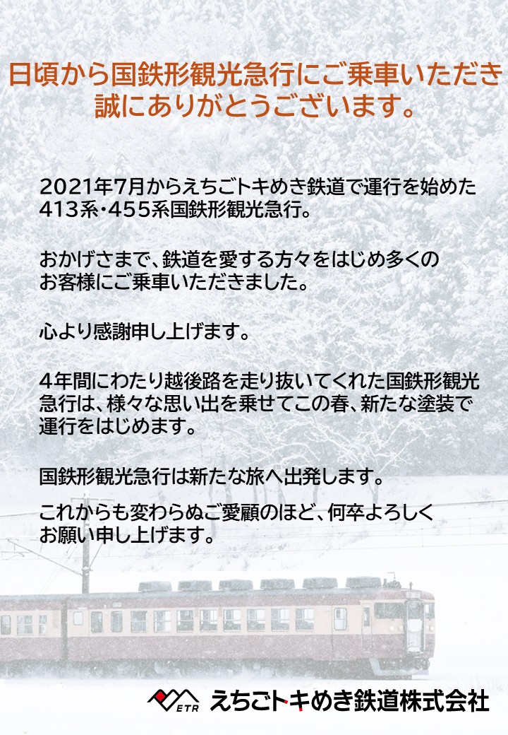 413・455系電車「国鉄形観光急行」の現行塗装「交直流急行色」での運行終了に合わせ、1月12日(月・祝)に感謝イベントが開かれます。合わせて、えちごトキめき鉄道の平井社長から413・455系電車の「新北陸色」への塗装変更後の愛称なども発表されます。