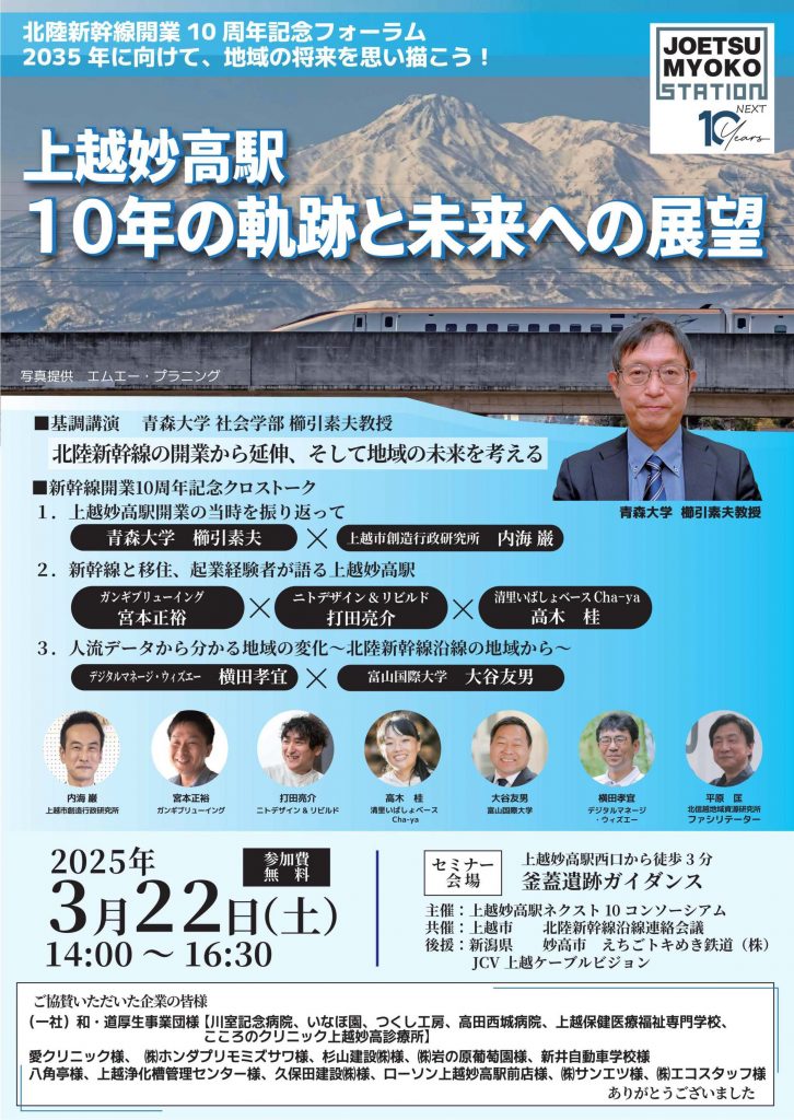 この記念フォーラムは「上越妙高駅ネクスト10プロジェクト」のキックオフイベントとして企画されました。これは開業10周年の大きな節目を迎えた北陸新幹線、えちごトキめき鉄道「上越妙高駅」の次の10年に向けて上越妙高駅の魅力を発信し、地域により活気を生み出そうとするプロジェクトです。