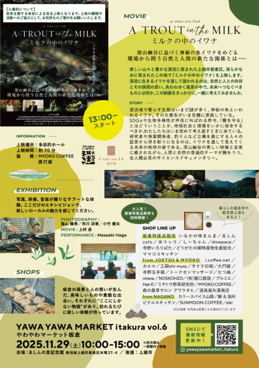 イベントでは上越市や妙高市の飲食ブースなどが並ぶほか、板倉区の特産品が販売されるほか、写真・映像・音楽が織りなすアートな体験ができます。このほか、渓流魚の「イワナ」に迫ったドキュメンタリー映画「A TROUT in the MILK ミルクの中のイワナ」が特別上映されます。