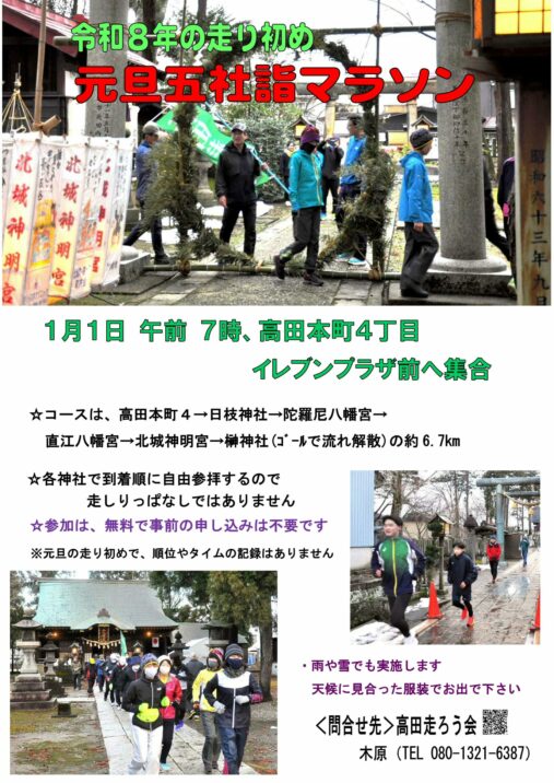 マラソン愛好家でつくる「高田走ろう会」の恒例行事のひとつ、上越高田の5つの神社を走って巡る「元旦五社詣マラソン」が1月1日に開催されます。