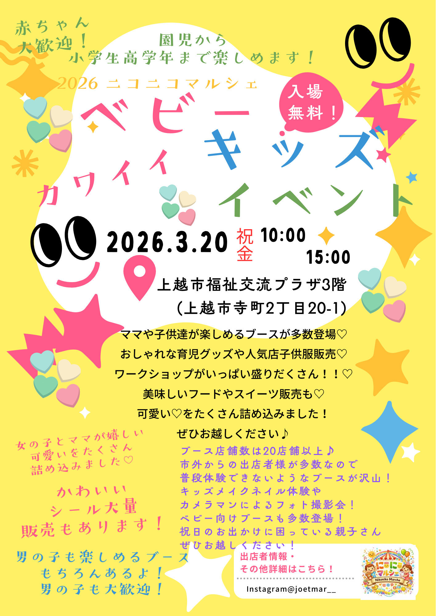子どもたちが楽しめるブースが20店以上出店するイベント「2026 にこにこマルシェ ベビーキッズイベント」が3月20日(金・祝)に上越市福祉交流プラザ3階で開催されます。