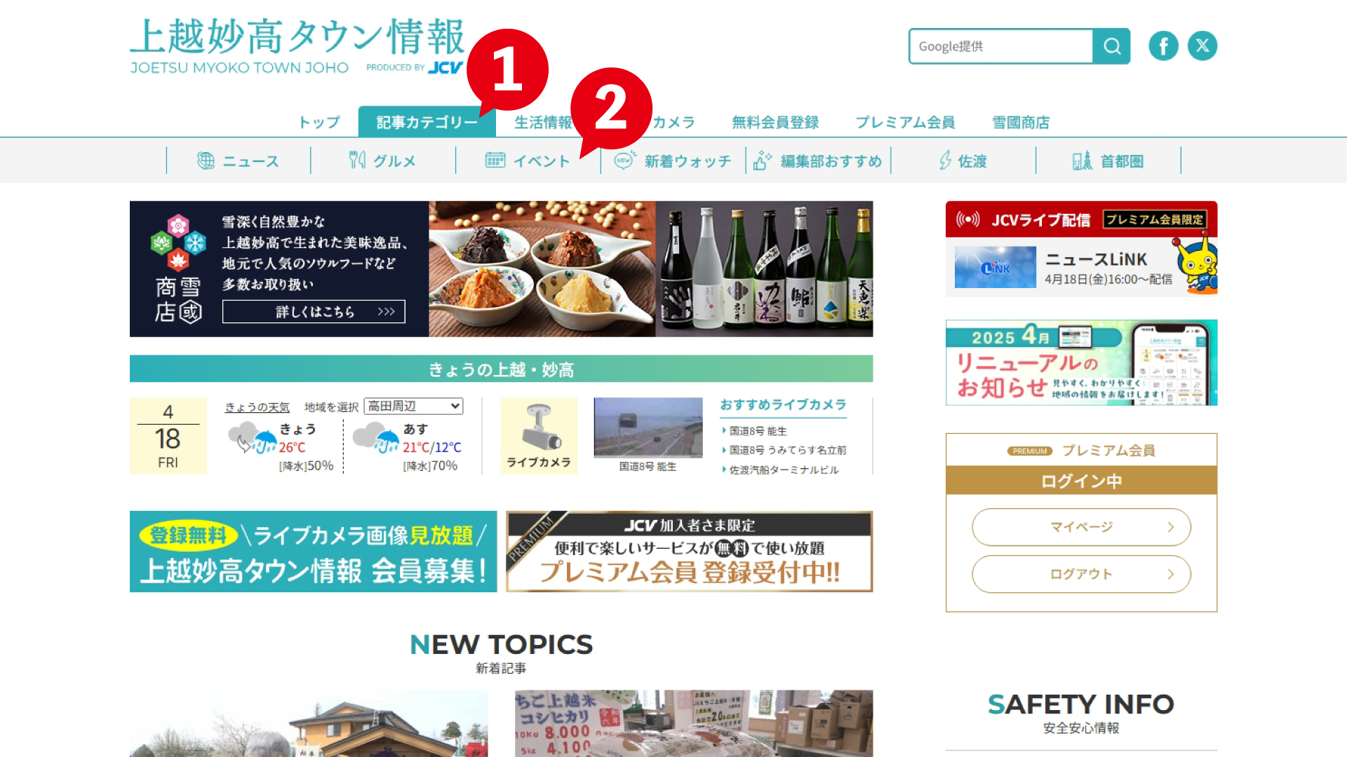 パソコンではトップ画面上の「記事カテゴリー(❶)」⇒「イベント(❷)」から、スマホではトップ画面の「イベント」を押してご覧ください。