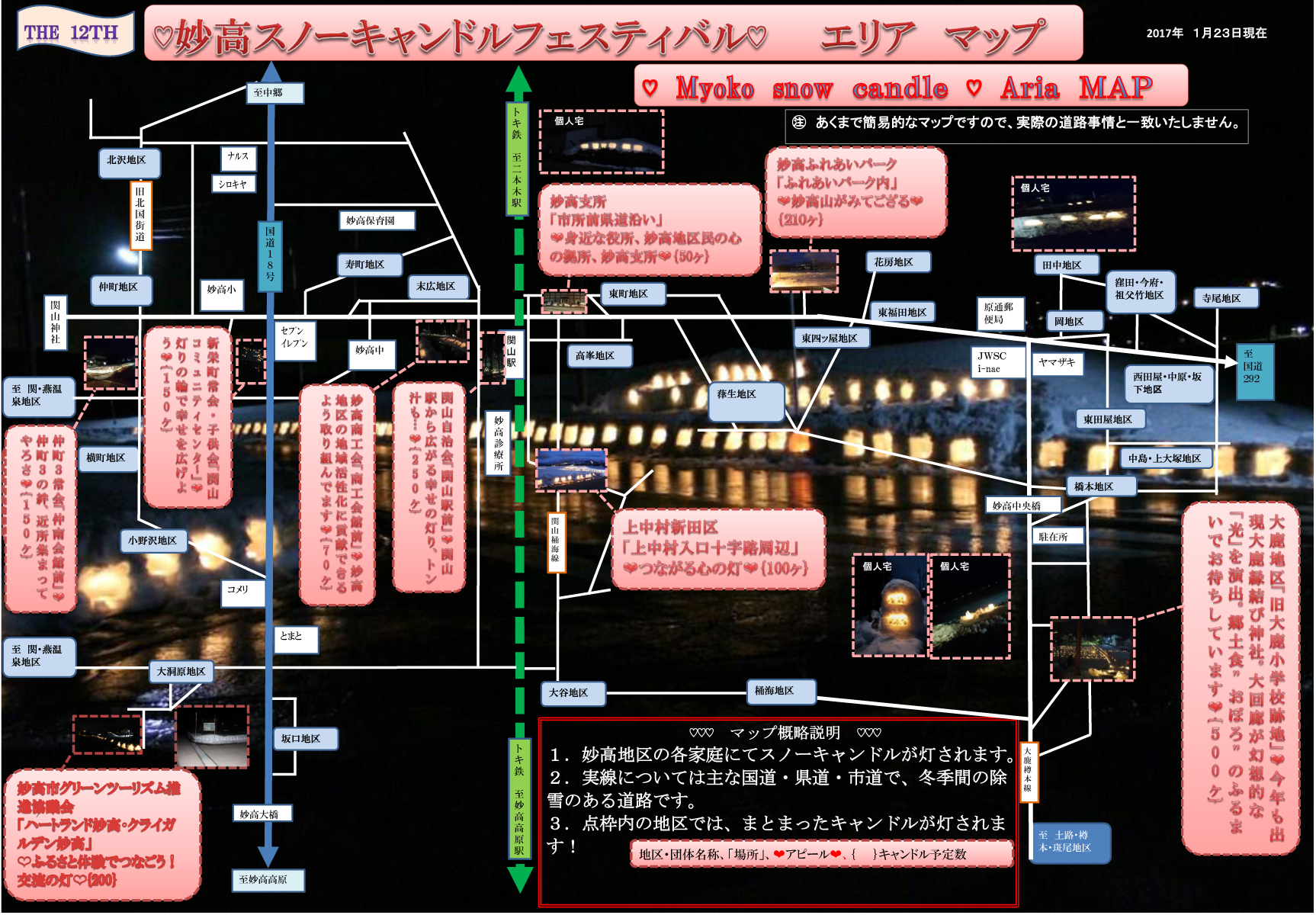 妙高市の妙高地区全域を会場に18日(土)、妙高スノーキャンドルフェスティバルが開催されます。妙高地区の全世帯が参加する地域イベントで、妙高地区の区民が、ふるさと妙高の冬を楽しむ“楽雪”をアイデアにすることで、地区の絆を強め、拡げていこうと開かれています。12回目の今年のテーマは「Candleの炎、灯りでつなごう心と心」です。