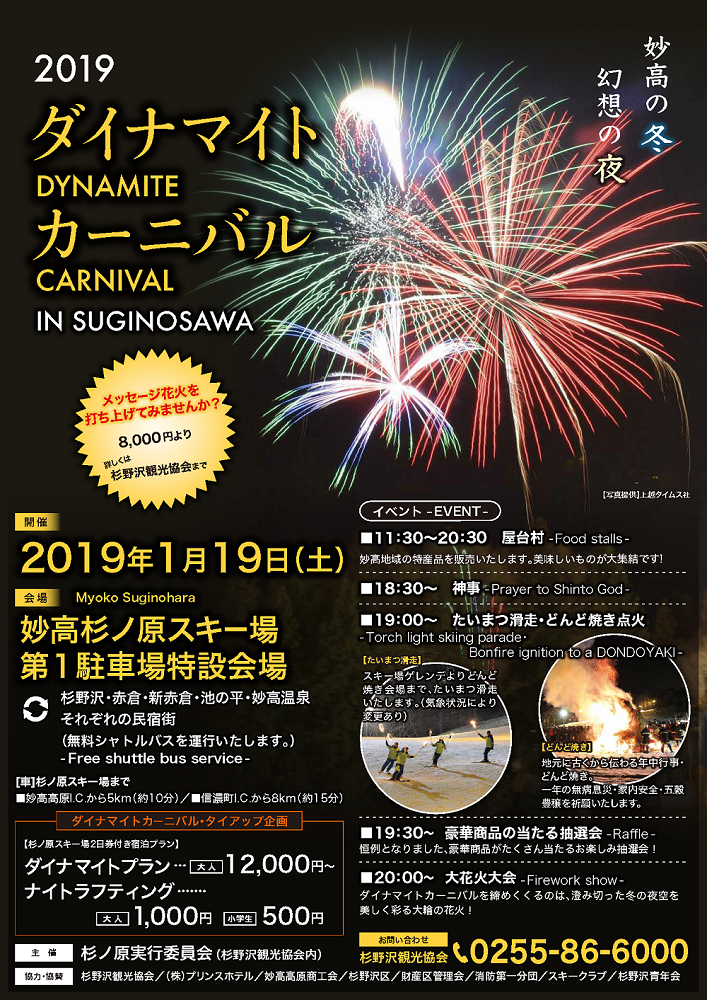 妙高市杉野沢地区の小正月行事「ダイナマイトカーニバル」が1月19日(土)に杉ノ原スキー場第1駐車場特設会場で行われます。