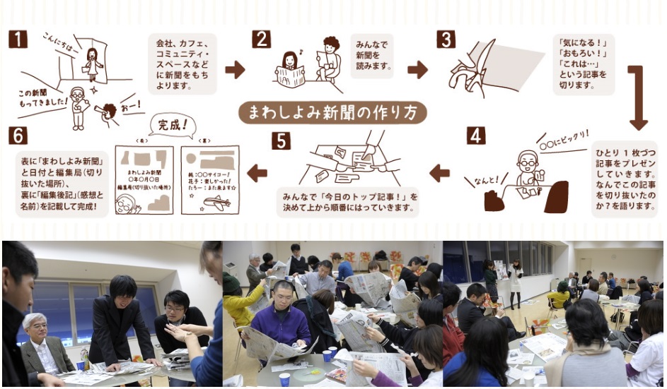 まわしよみ新聞とは、自分が読んで面白い!と思った記事を持ち寄り、1つの新聞をつくるもの。その新聞をもとに参加者で話し合ったり、色んな意見を聞いたりするコミュニケーションツールです。