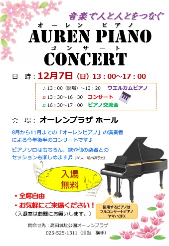 ■日時:12月7日(日)開場・ウエルカム演奏 13:00、コンサート 13:30~16:30、ピアノ交流会 16:30~17:00