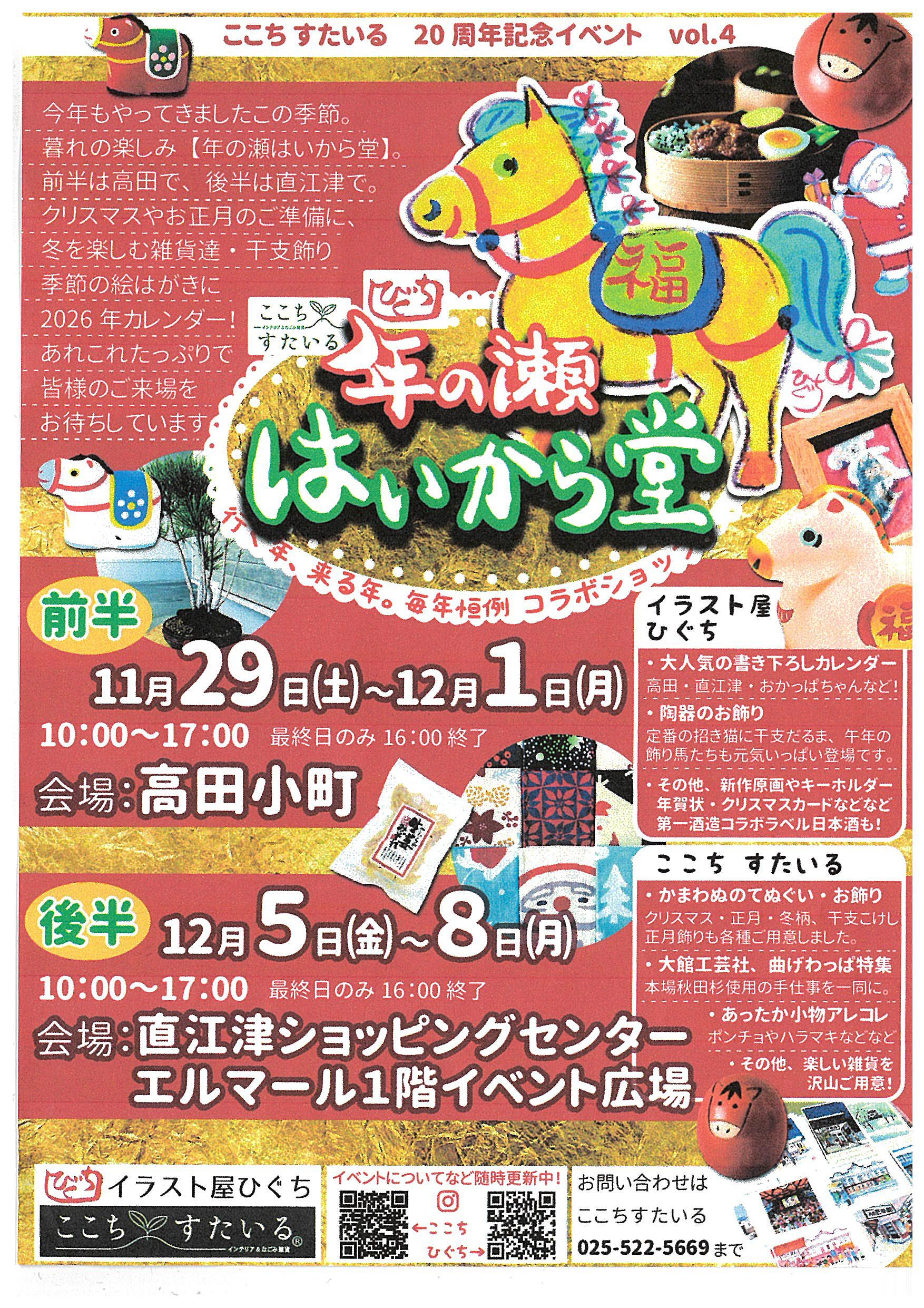 毎年恒例の暮れの楽しみ「年の瀬はいから堂」。クリスマスやお正月の準備、冬を楽しむ雑貨、干支飾り、季節の絵はがき、2026年のカレンダーなどを販売。