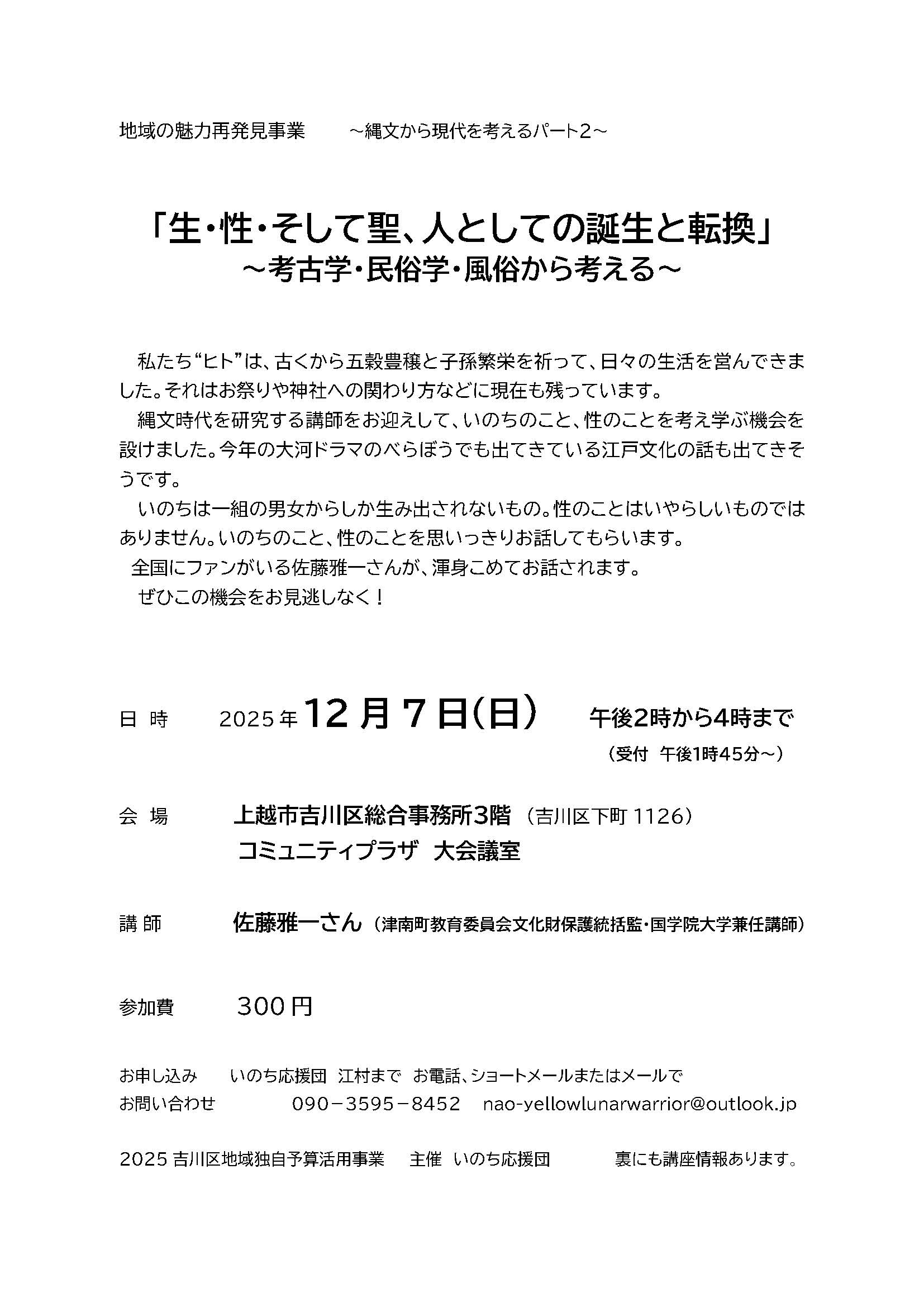 いのちのこと、性のことを考え学ぶ「生・性・そして聖、人としての誕生と転換 ~考古学・民俗学・風俗から考える~」が吉川区総合事務所で開催されます。講師は縄文時代について研究をしている津南町教育委員会の佐藤雅一さんです。