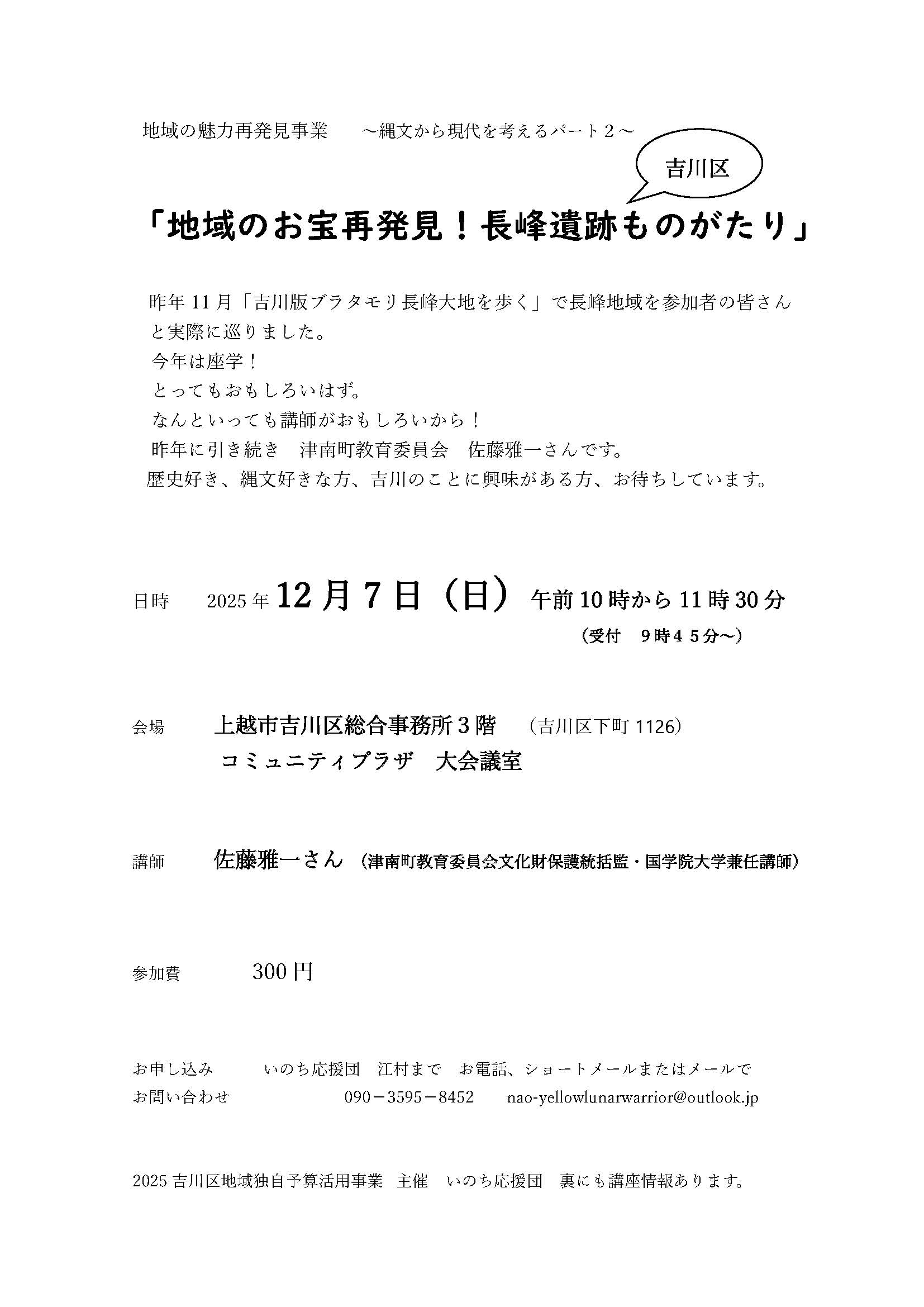 座学「地域のお宝再発見!長峰遺跡ものがたり」が吉川区総合事務所で開催されます。講師は津南町教育委員会の佐藤雅一さんです。