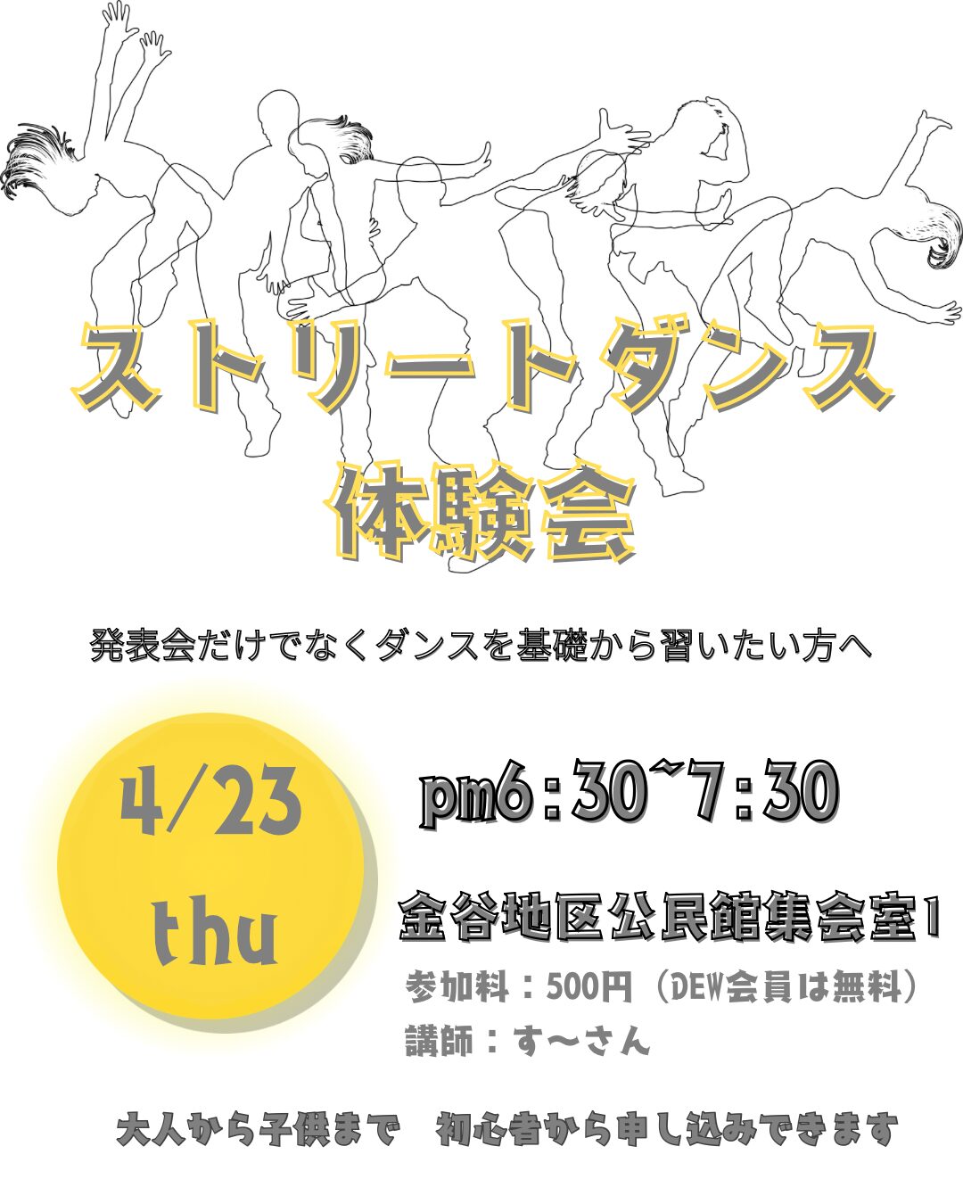 ダンスを基礎から習いたい人や興味のある人に向けた、ストリートダンス体験が開かれます。子どもから大人までどなたでも参加できます。参加希望の人は、電話かメールで事前の申し込みが必要です。