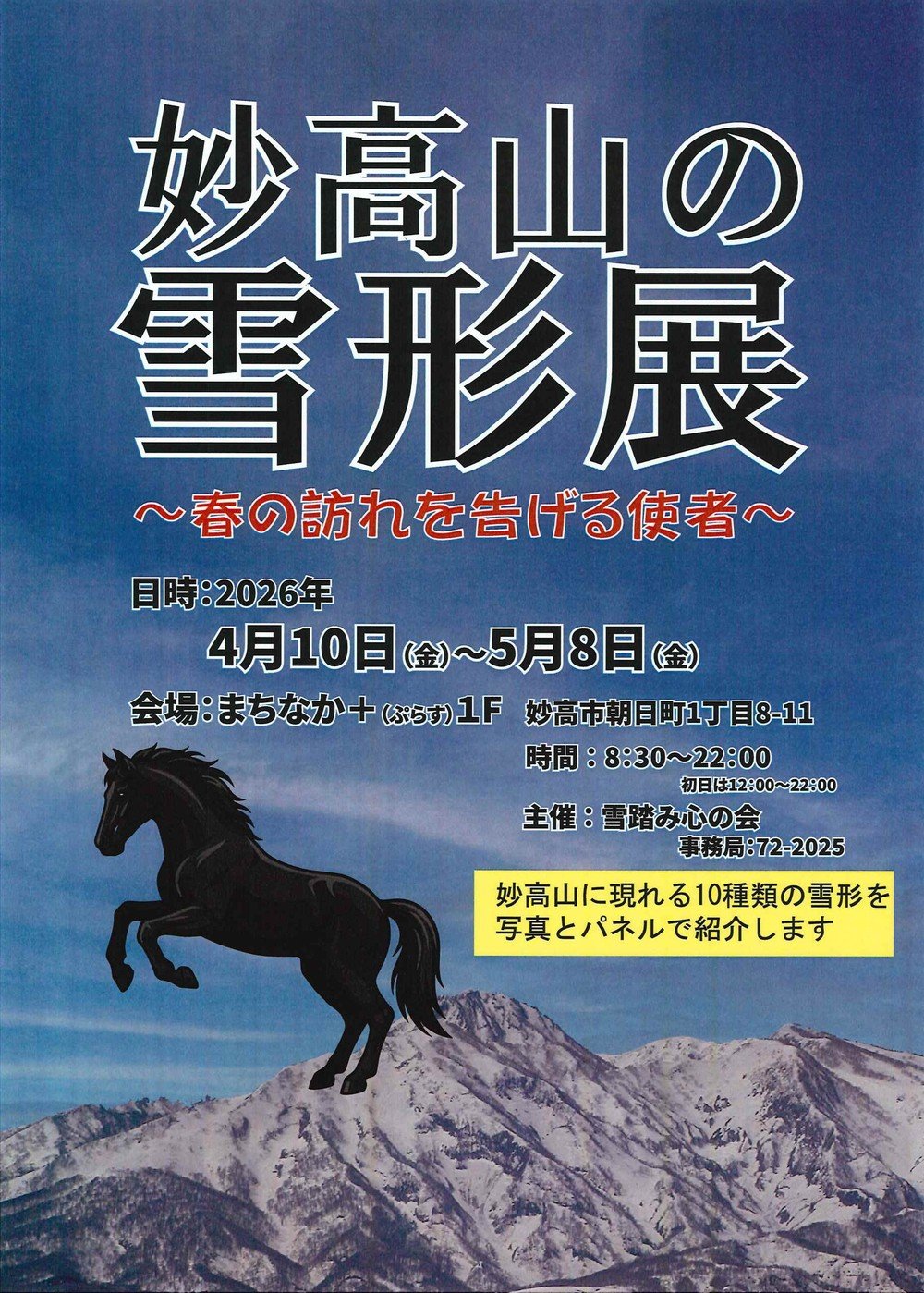 妙高山に現れる10種類の雪形を写真とパネルで紹介します。