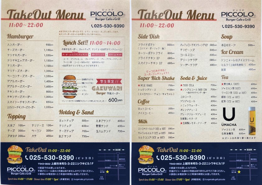 ハンバーガーショップ「バーガー カフェ&グリル ピッコロ」が3月20日(日)に上越市本町にある八十二銀行高田支店の有料駐車場の向かいにオープンしました。