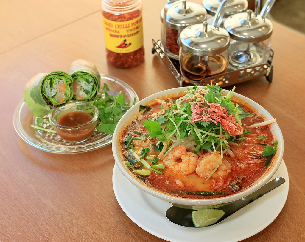 麺料理の中でも人気なのは「トムヤムヌードル」です。ココナッツミルク、鶏とエビのダシをベースにした酸味のある辛いスープに、本場の米麺を合わせています。エビ、トウミョウ、キクラゲ、ネギ、ニラなど具だくさんで、上越産のパクチーがたっぷりのっています。辛さが抑えられたやさしい味わいで、トムヤムクンが苦手な人や年配のお客さんにも喜ばれている一杯です。こちらで提供しているメニューのほとんどに、生春巻きが付きます。