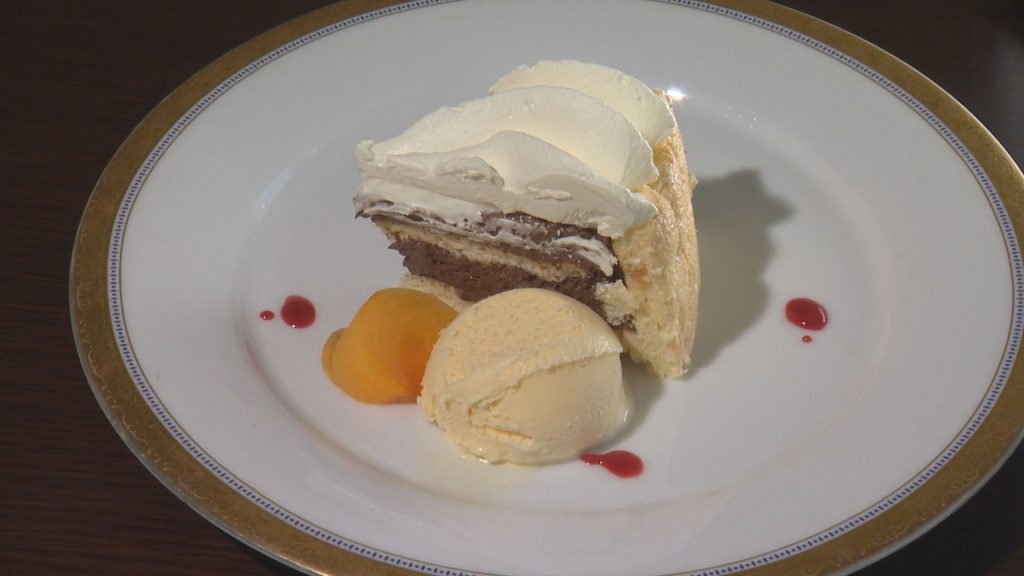 続いては外側の生地が特徴的な「チョコレートのシャルロット」。ふんわりと軽いスポンジ風のしぼり生地の中にチョコムースがたっぷりと詰まっています。