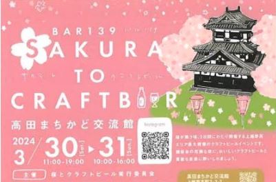 今月29日(金)に開幕する「第99回高田城址公園観桜会」にあわせ、今月30日(土)、31日(日)の2日間、上越市本町3丁目の高田まちかど交流館でクラフトビールが楽しめるイベント「桜とクラフトビール バル139」が開催されます。