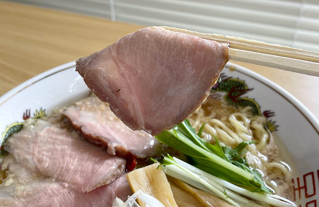 チャーシューメンにはどんぶりを覆うほどの大きさのチャーシューが5枚のっています。豚の肩ロースを使ったチャーシューで、やわらかくしっとりとした食感。スープに合わせて、こちらもやさしい味わいに仕上げています。