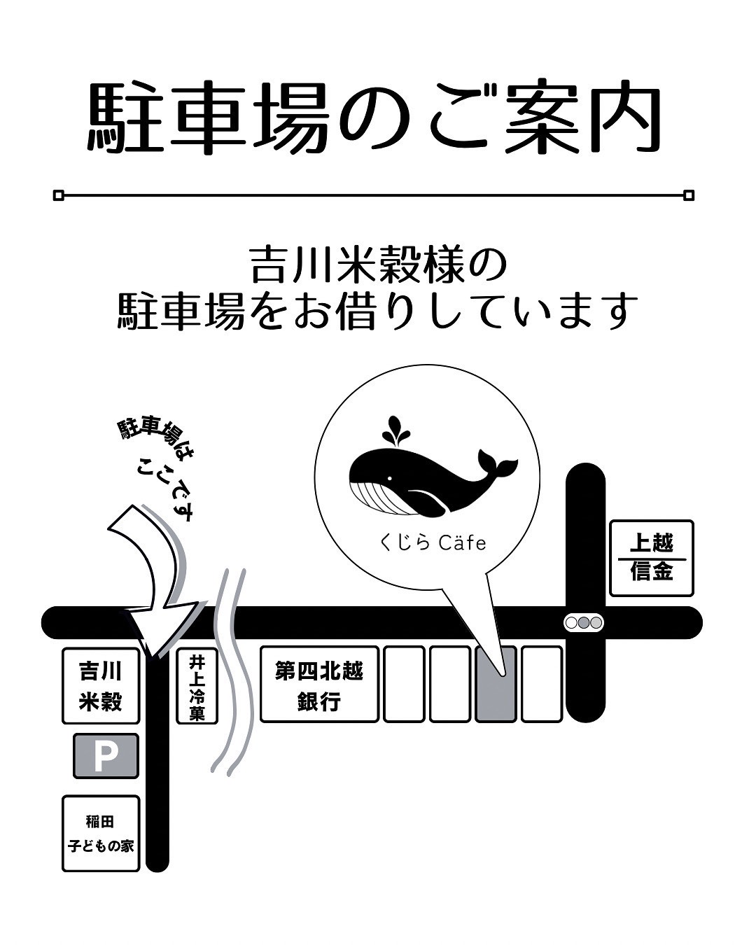駐車場は店から少し離れたところに2台分を設けています。くじらカフェから少し高田方面に走り、井上冷菓と吉川米穀の間を左折。吉川米穀の駐車場の中に、くじらカフェと書かれたブロックが置いてある2台分です。