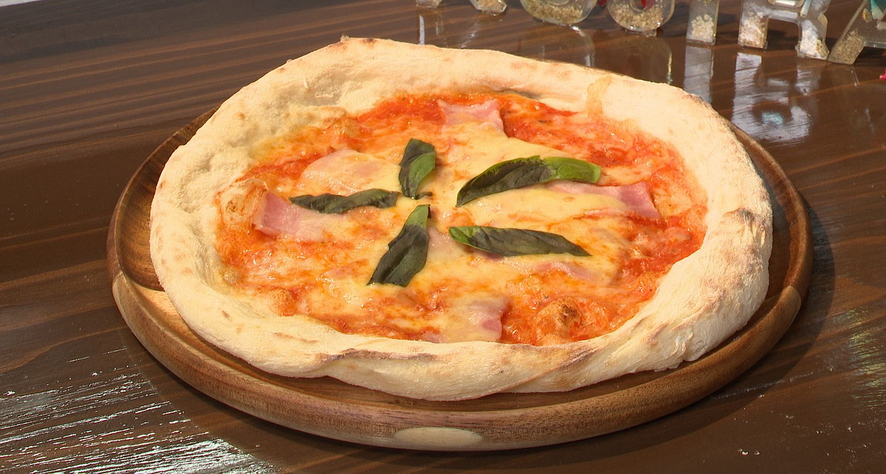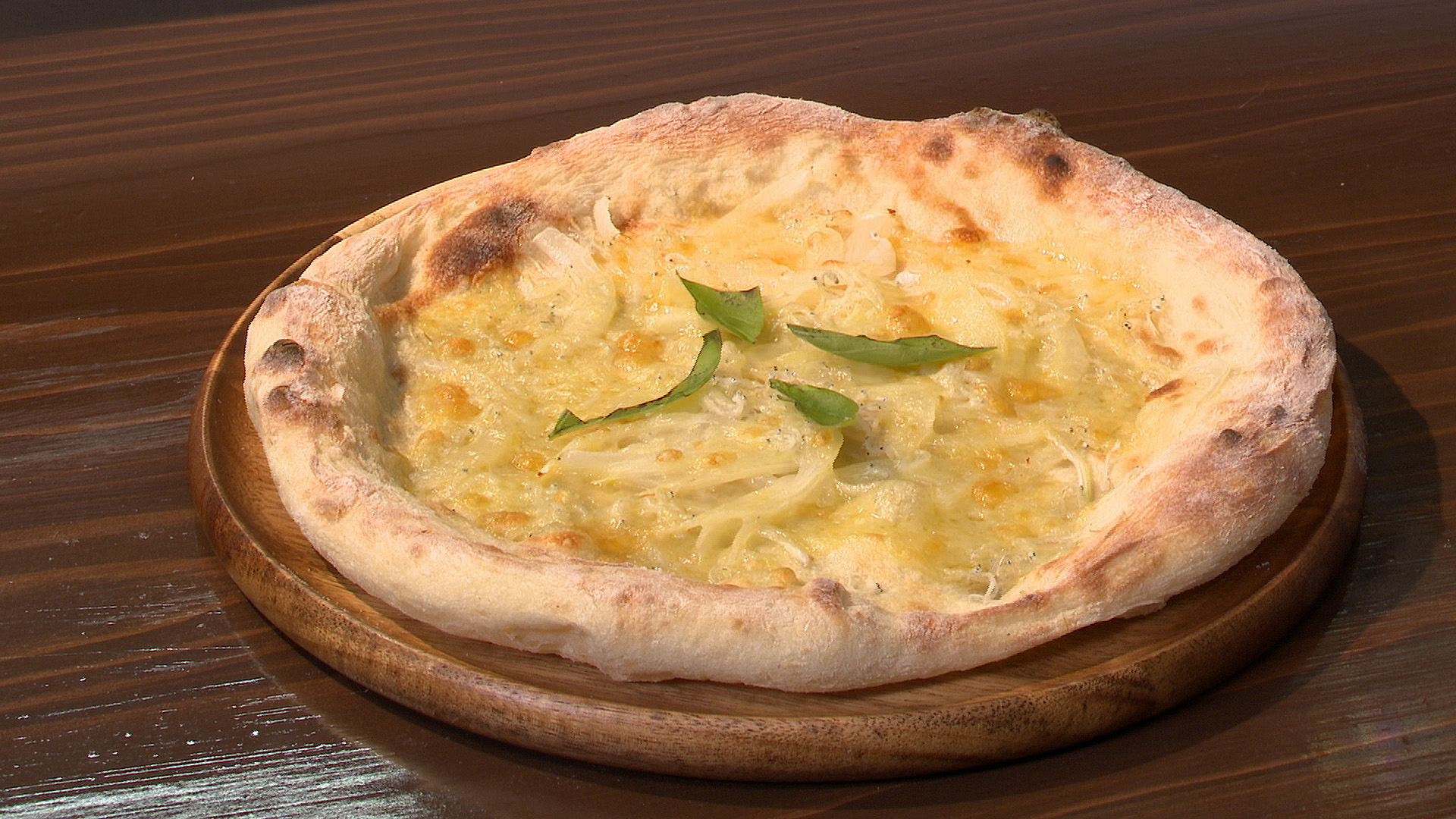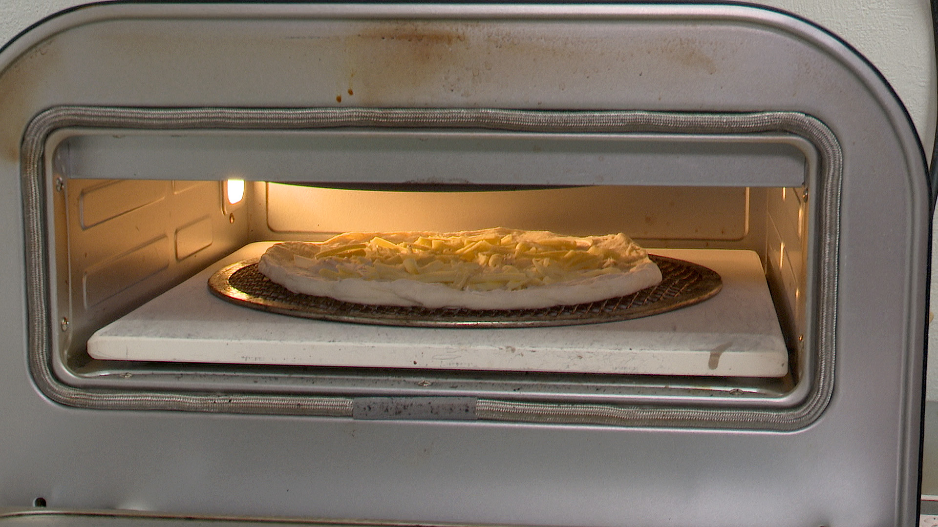 上越市内の飲食店で修業して作り方を教わったというピザは、モチモチ食感の生地が特徴。丁寧に生地を延ばし、具材をトッピングしてピザ専用の電気窯で焼き上げています。