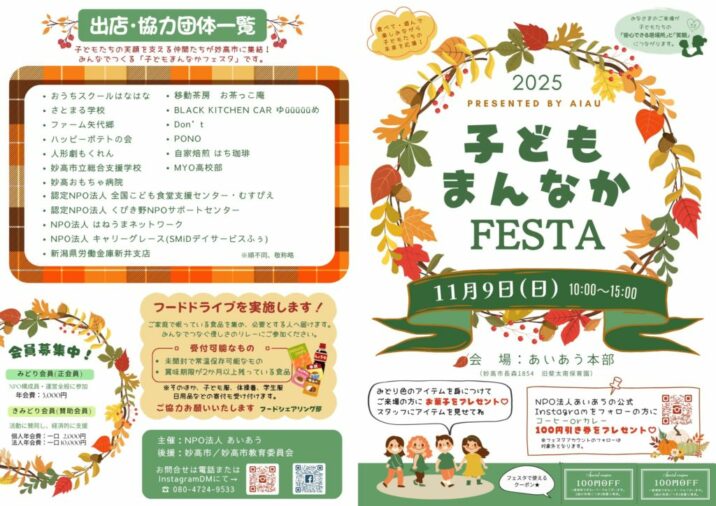 食べて、遊んで、楽しみながら子どもたちの未来を応援する、みんなでつくるイベント「子どもまんなかFESTA」が11月9日(日)、妙高市長森の旧斐太南保育園(あいあう本部)で開催されます。