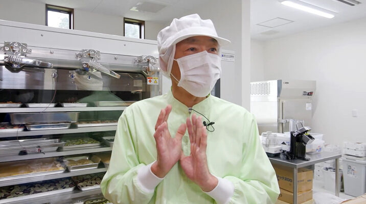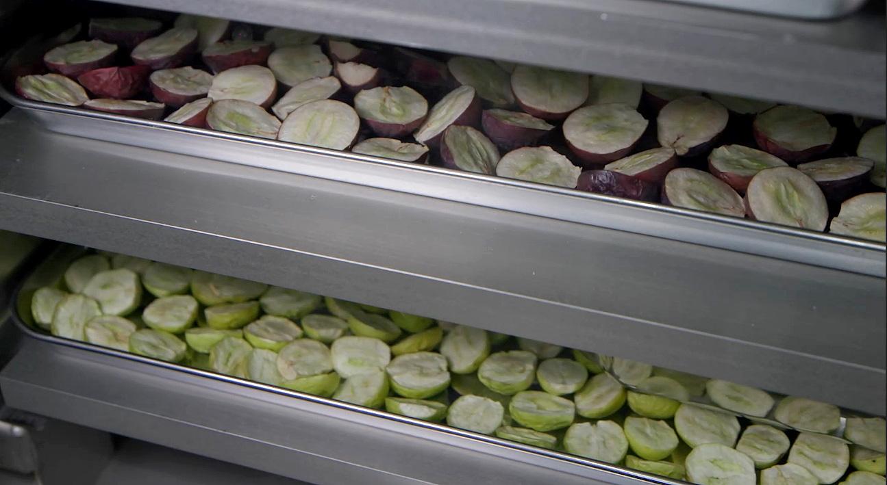 「フリーズドライは素材を切って、一旦冷凍している。その時にしっかり冷凍しないと良いものができない。本来はゆっくり凍らせるのがフリーズドライにはいいが、すべてがそうではなく、素材によっては強い冷凍をかけて一気に凍らせることもやっている。なかには色が悪くなってしまうものもあるので、試行錯誤しながら。すべてはお客様に喜んでいただけるものを作りたいという思いから」