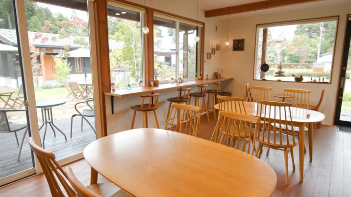 自然豊かな三和区に、2018年オープンした「マンマルテラス」。ログハウス調の店内は、木のぬくもりを感じる癒しの空間です。