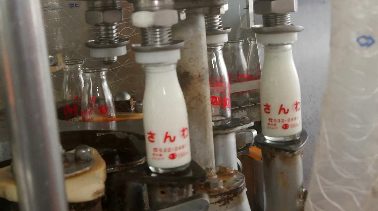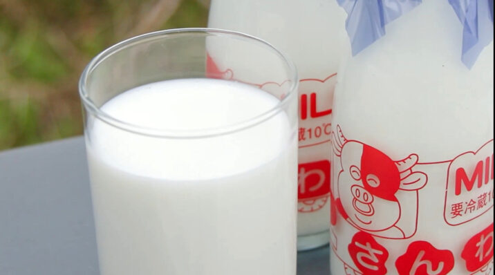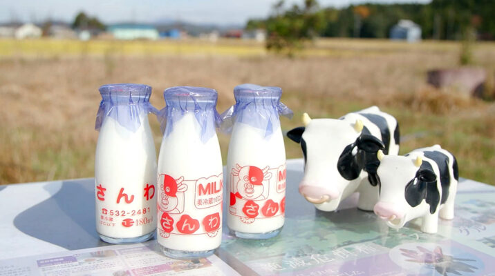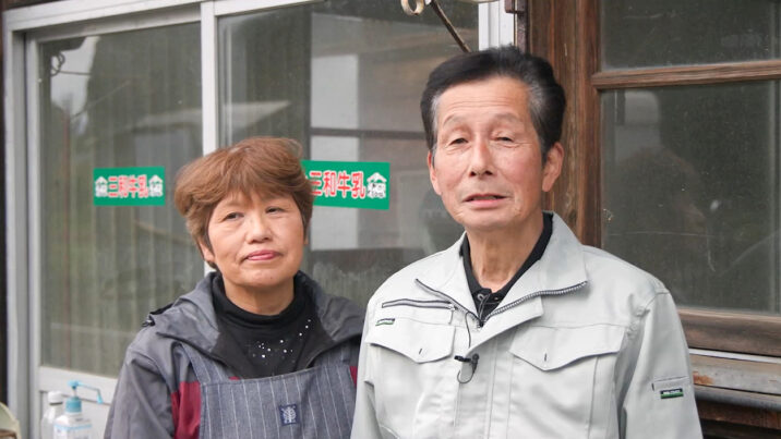 昭和22年創業の三和牛乳。現在は二代目の梨本一郎さんと妻の厚子さんが二人三脚で3頭の乳牛を飼育しています。搾乳から生乳の殺菌、瓶詰、販売までを一貫して行っているのは県内ではここだけです。