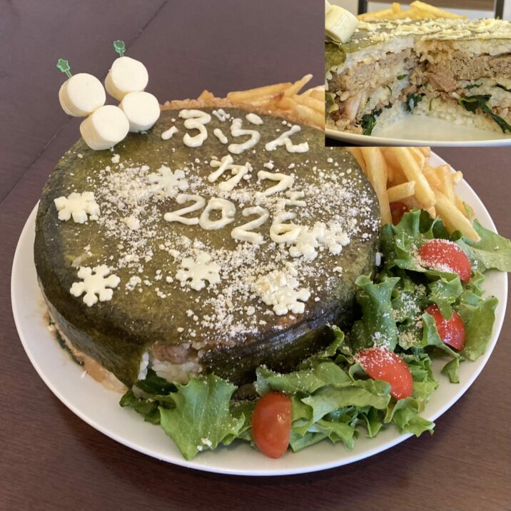 好評の巨大肉肉おにぎりの2026年Ver. 総重量2キロ超え。今年もふんだんに肉、肉、肉。グレードアップしたぶらんカフェのガチ盛りを是非ご賞味下さい。