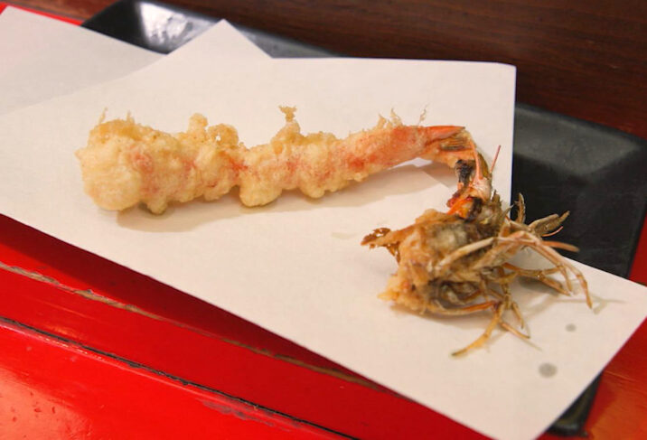 こちらは車海老の天ぷら。頭は濃厚なエビ味噌の香りとサクサクとした食感が楽しめ、身はプリプリとして引きしまっています。