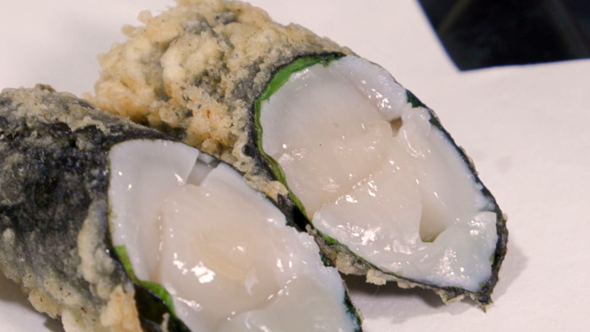次はホタテの貝柱に海苔と大葉が巻いて揚げるホタテ。こちらはレモンと塩で食べます。