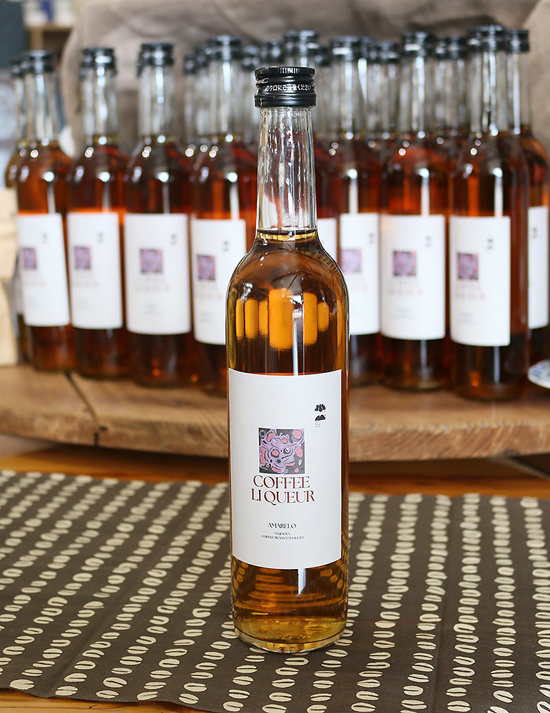コーヒーのプロ 山倉社長は独自で試作を繰り返し、コーヒーリキュールに合うコーヒー豆としてブラジル産のアマレロを選びました。黄色い果実をつける希少な品種で、その中でもスペシャルティコーヒーと呼ばれる高品質の豆のみを使用しています。丁寧に浅煎りで焙煎した豆を、竹田酒造店で日本酒を作る際に使われる醸造アルコールに漬け込むことで、華やかな香りとクリアな後味を引き出しています。アルコール度数も少しずつ変えながら試作し、アルコール度数25%の大人の味わいが楽しめるリキュールが完成しました。