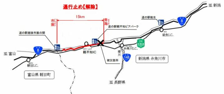 28日(火)、国道8号 糸魚川市青海で土砂崩れが発生し、午前10時45分から青海から市振間が全面通行止めになっていましたが、復旧作業が完了し安全が確保されたため、午後6時に解除され…