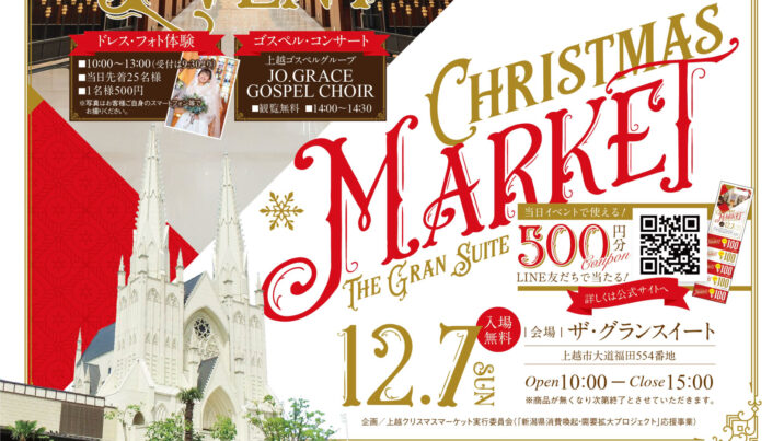 上越市大道福田の結婚式場ザ・グランスイートの洗練された空間の中で、ひと足早くクリスマスの雰囲気が楽しめるマルシェイベント「クリスマスマーケット2025」が12月7日(日)に行われま…