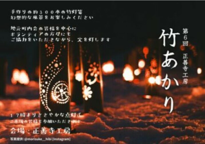 手づくりの竹灯篭が駐車場に並び幻想的な風景が楽しめるイベント「第6回 正善寺工房 竹あかり」が2月15日(日)に上越市下正善寺の正善寺工房で行われます。 会場となる正善寺工房を中心…
