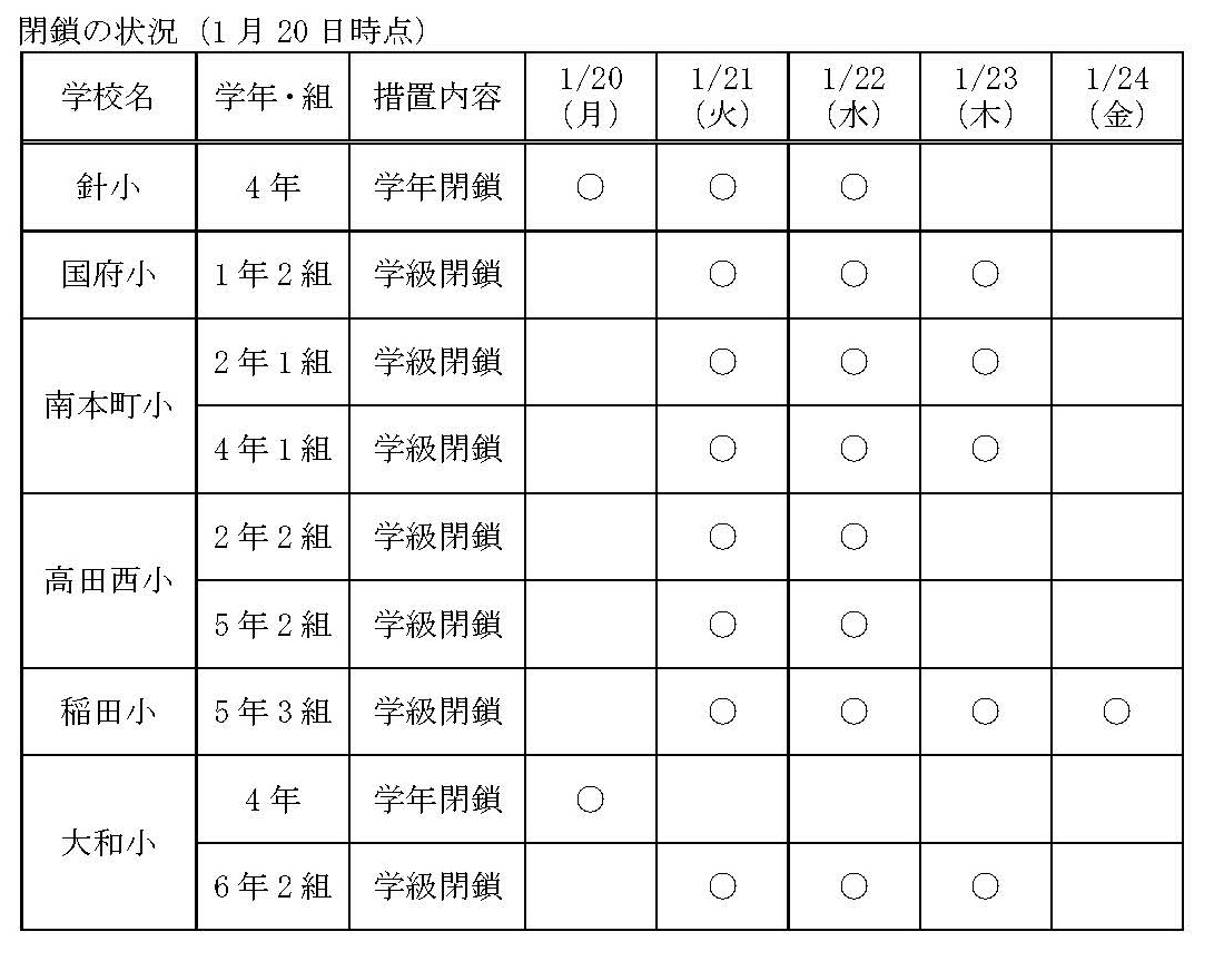 インフルエンザで欠席者が相次ぎ、下記の小学校で学年・学級閉鎖の措置をとる。