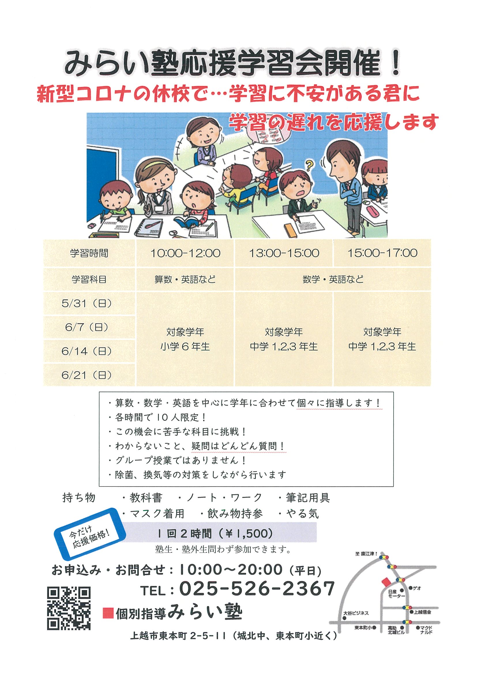 上越市東本町にある「個別指導 みらい塾」は、新型コロナウイルスの影響で休校となり、学習に対して不安や、勉強の遅れが心配な児童・生徒を対象に、個別指導を行う応援学習会を開催する。