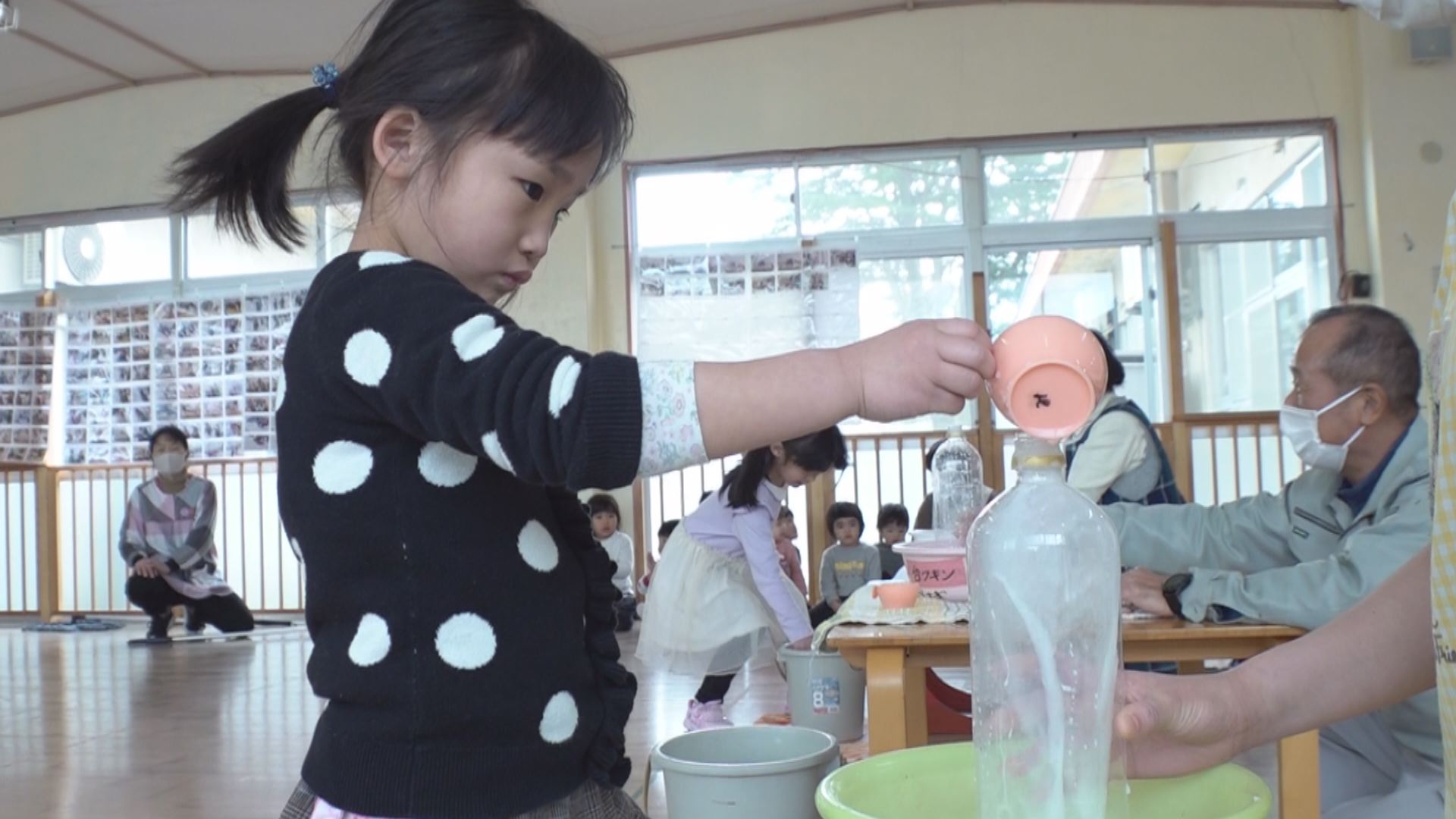これは色水を白酒に見立て、ペットボトルに水を入れるゲームです。年少から年長までの園児が挑戦しました。