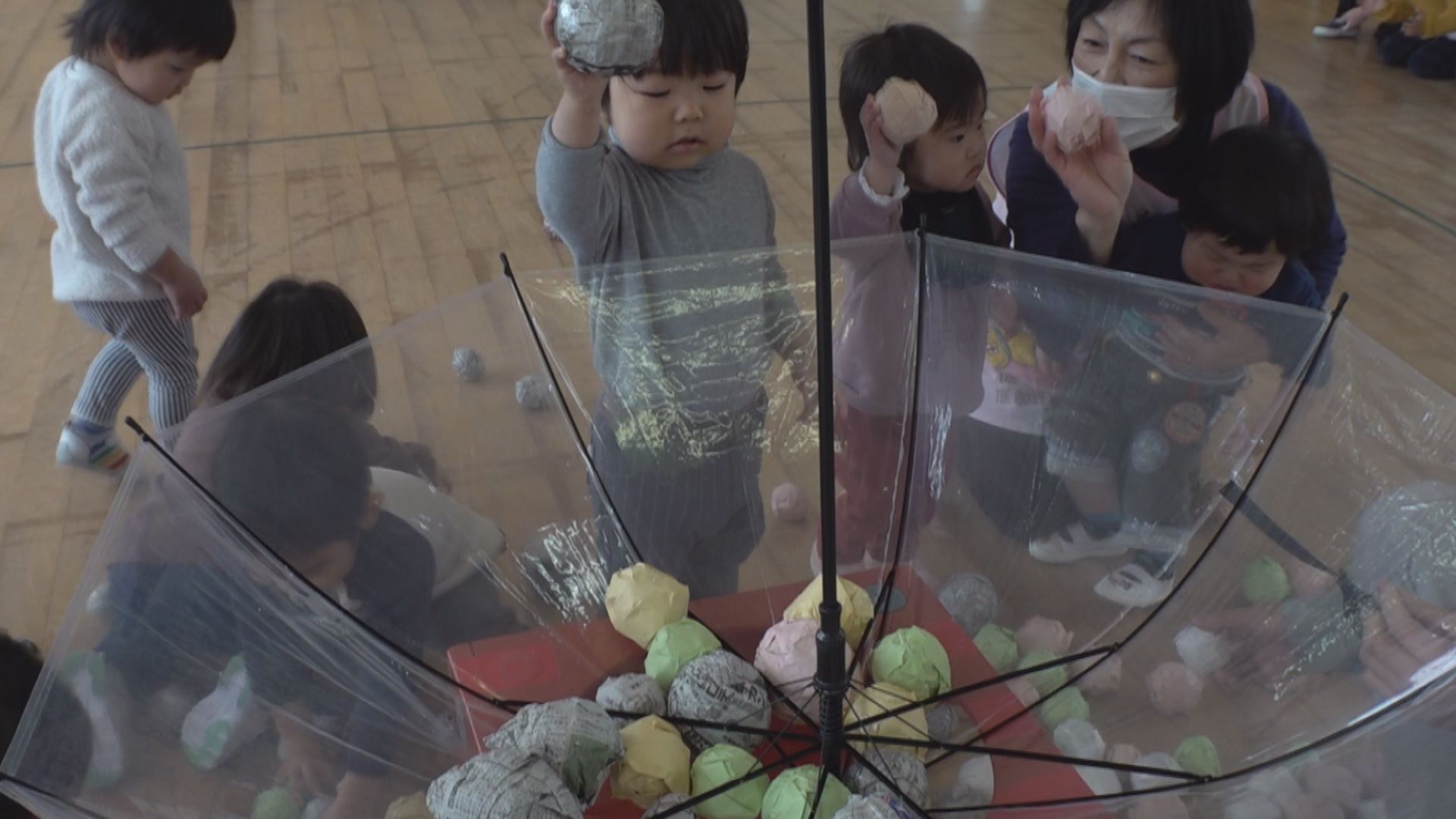 続いてひなまつりにちなんだゲームが行われ、未満児が丸めた紙をひなあられに見立てた玉入れに挑戦しました。