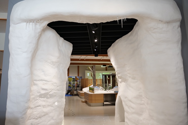 施設の目玉は、正面入口を抜けて左側のスペースに開設された展示室です。雪壁のオブジェをくぐり抜けると、妙高戸隠連山国立公園の歴史、自然、魅力を紹介するコーナーが広がります。