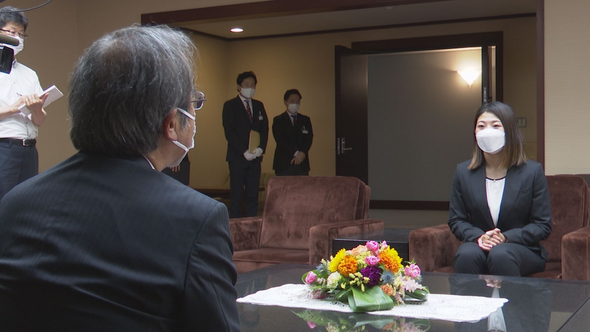 冨田せなさんは妙高市出身の22歳です。今大会に出場して初めて銅メダルを獲得しました。オリンピックに出場したのは4年前の平昌以来2回目で、平昌では8位の入賞でした。この日は、花角知事から新潟県民栄誉賞の賞状と記念品が手渡されました。