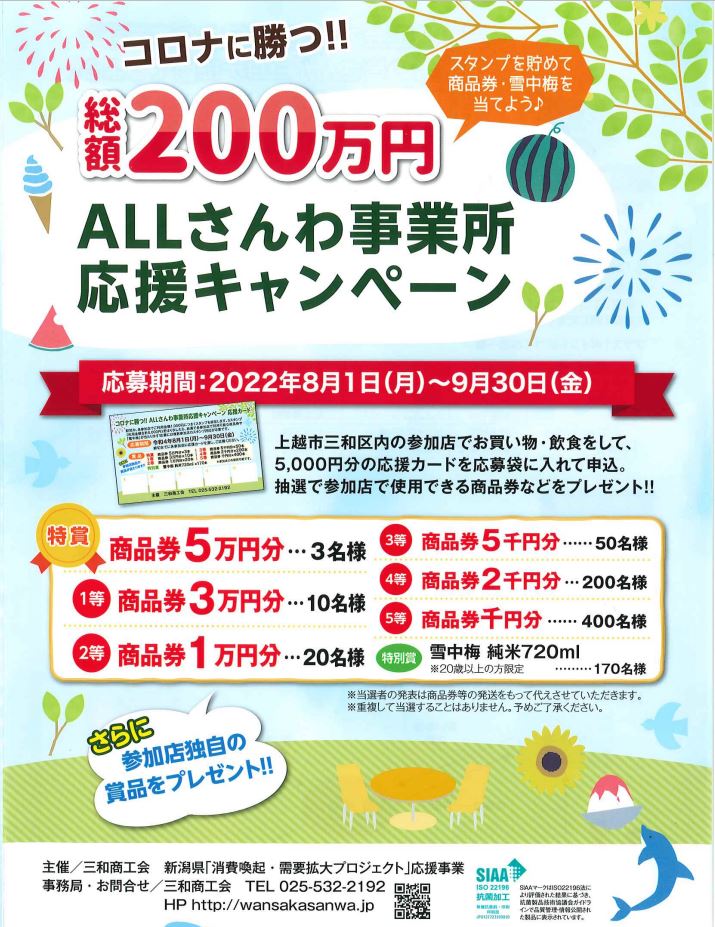 上越市三和区で買い物や飲食をしてスタンプを集めて応募すると、総額200万円分の商品券や雪中梅が当たるキャンペーンが開催されます。