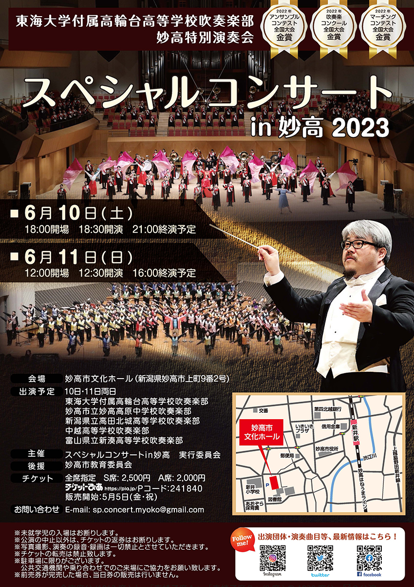 ゲストとして出演するのはテレビ番組にも多数出演し、2022年度の吹奏楽連盟が主催するアンサンブルコンテスト、吹奏楽コンクール、マーチングコンテストの3部門すべての全国大会で金賞を受賞した東海大学付属高輪台高校をはじめ、吹奏楽コンクールで長年新潟県代表として活躍している長岡市の中越高校、同じく富山県代表として活躍している富山県立新湊高校の吹奏楽部の皆さんです。地元からは妙高市立妙高高原中学校、新潟県立高田北城高校の吹奏楽部が出演します。